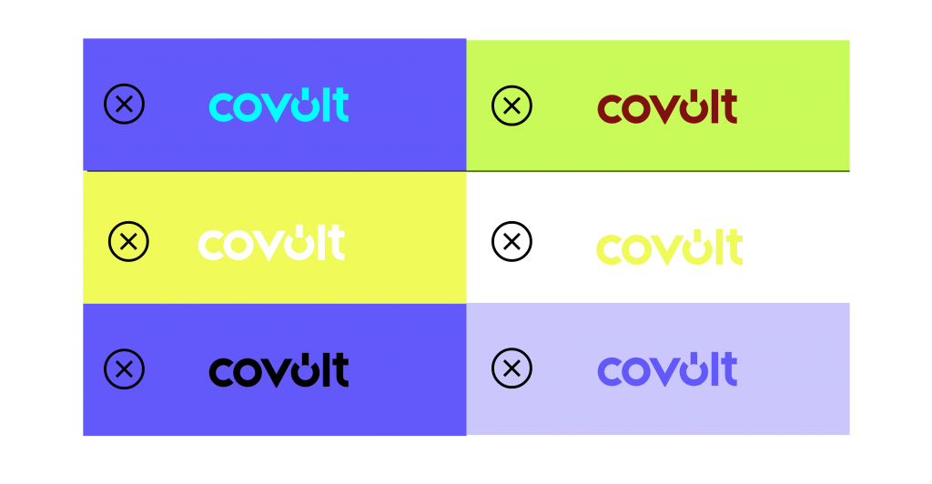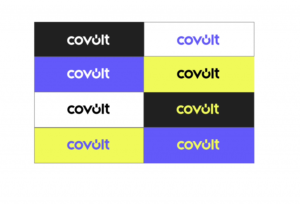 Hieronder worden alle mogelijke combinaties van het logo gepresenteerd, toegepast op het kleurenpalet. Het contrast speelt hierbij een cruciale rol. Het is belangrijk om te benadrukken dat Yellow Volt nooit op een witte achtergrond gebruikt mag worden.